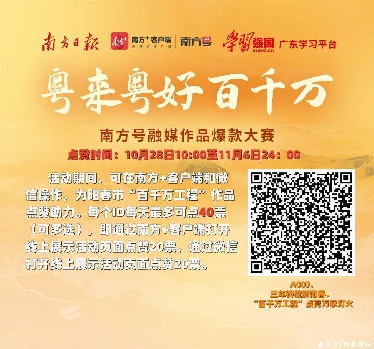 为生动展现广东“百千万工程”的丰硕成果与澎湃活力,由南方日报、南方+客户端和“学习强国”广东学习平台联合主办的“粤来粤好百千万”南方号融媒作品爆款大赛,于今日启动终评展示。由阳春市融媒体中心创作和推送的精品力作脱颖而出进入本轮比拼,大家一起来助力吧!