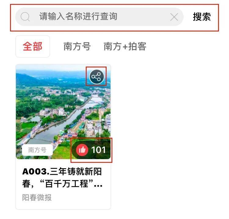 2.进入“粤来粤好百千万”展示界面后,可在搜索栏输入你支持的作品编号或标题关键信息,A003.三年铸就新阳春,“百千万工程”点亮万家灯火,点击图片右下方点赞标志助力;也可点击图片右上角分享按钮转发邀请朋友、群友点赞。